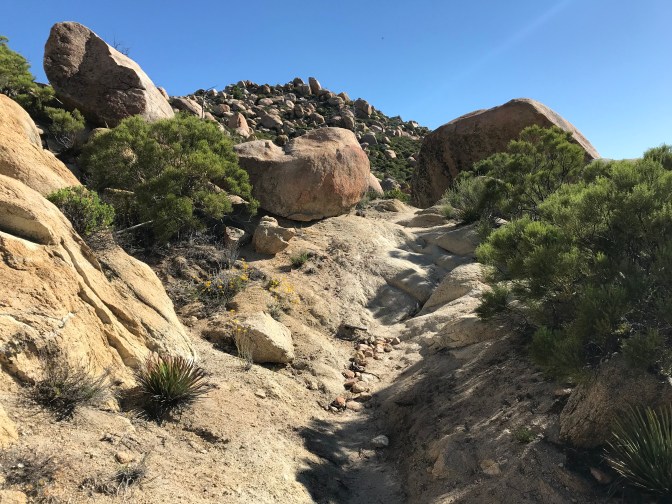 The mileage before me seemed daunting, but sustained by your prayers and good wishes and fueled with an extra dose of instant coffee in one of my water bottles, I set off using the headland until I had climbed out of the Aqua Caliente canyon. Sunrise was lovely but the day already warm, at 5:30am.