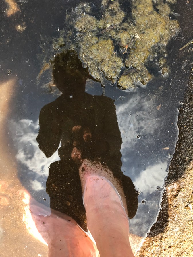 This picture shows my feet and my reflection in the slimy algae ridden micro pool.