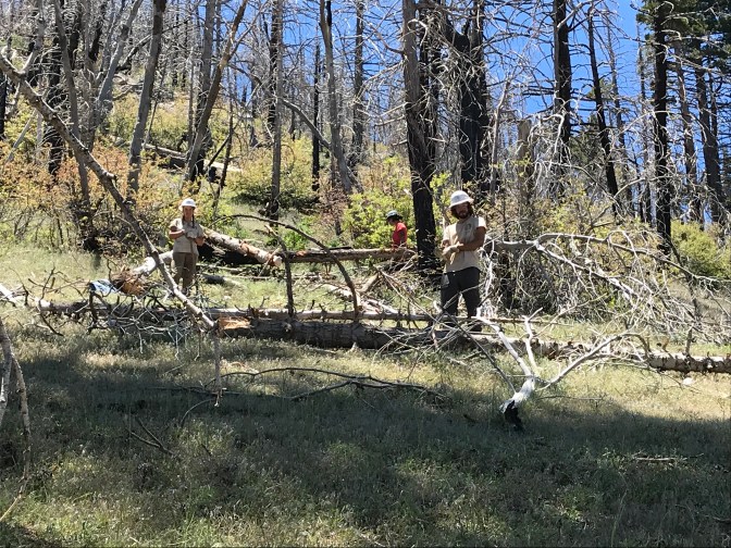 This section of trail has suffered extensively from fire damage and fallen trees have been notorious trail annoyances. Further up the trail I encountered a trip of stalwart PCT trail workers. This work requires that all equipment ( including crosscut saws)be packed in on the workers backs. Sometimes as far as 30 miles. I’m the heavily damaged areas equestrian assistance is not possible. The crews names are Elonore, Liam, and Hannah.