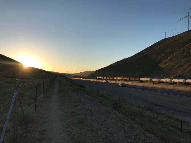 The trail starts along Highway 58 where you can see the sunrise shining on the trains.