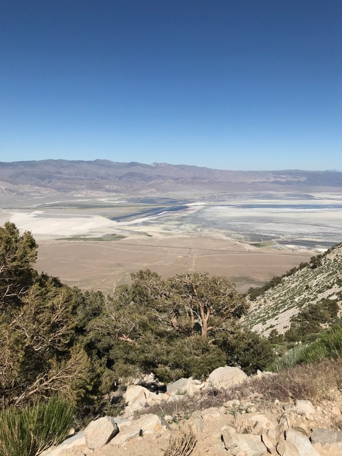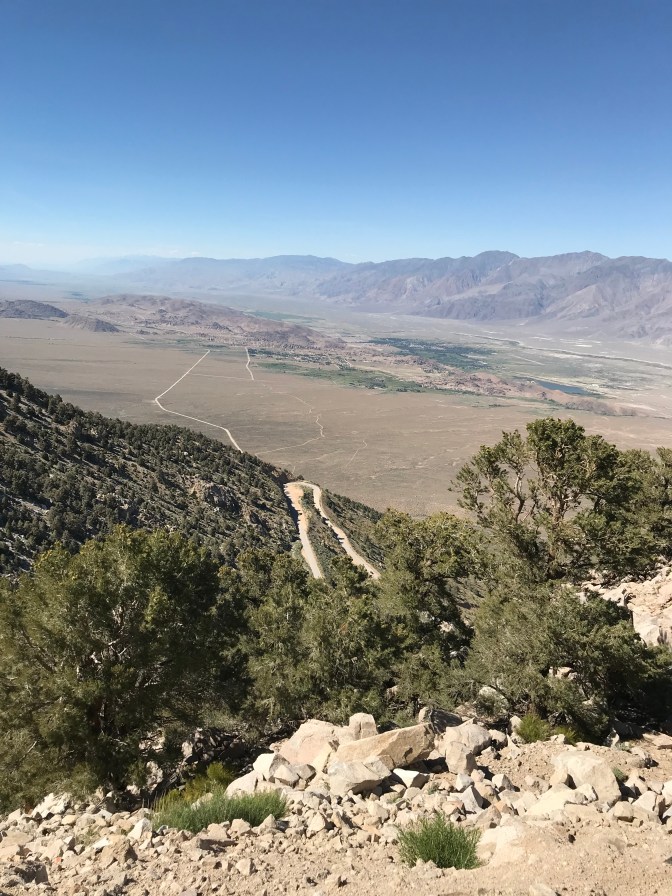 After a quick exploration of the town of Lone Pine (elev. 3,727′) and getting a couple cookies at the bakery (it’s a real town) I drove up the Horseshoe Meadow Road to where I would be meeting Runningbird the next morning. Horseshoe Meadow is up (another) very windy and steep road at 9,900′ in the John Muir Wilderness and the Southern Sierras. When I departed Lone Pine the temp was 95 degrees. I timed the drive to the top at about 35 minutes where it was more than 20 degrees cooler. Once there I did a short hike on the trail, conversed with a couple of PCT section hikers that were coming in about river conditions, and headed back down.