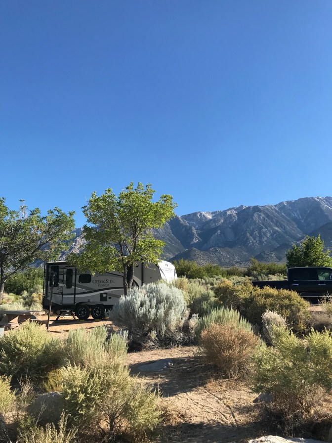 Wingman from the Roadside: After walking Runningbird to the Kennedy Meadows Campground PCT Trailhead I returned to the campsite and packed up for the move. The trip down the curvy steep road went well. I didn’t see any other cars (7 AM) and just took it slow. At the bottom of the hill I hooked up with the 395 going north to Lone Pine, access to Mt. Whitney. After stopping at the Ranger station and getting a lot of great information I headed for the Tuttle Creek Campground (BLM) and scored a most excellent site where the creek was flowing right beside me and the spot was perfectly level. Score!