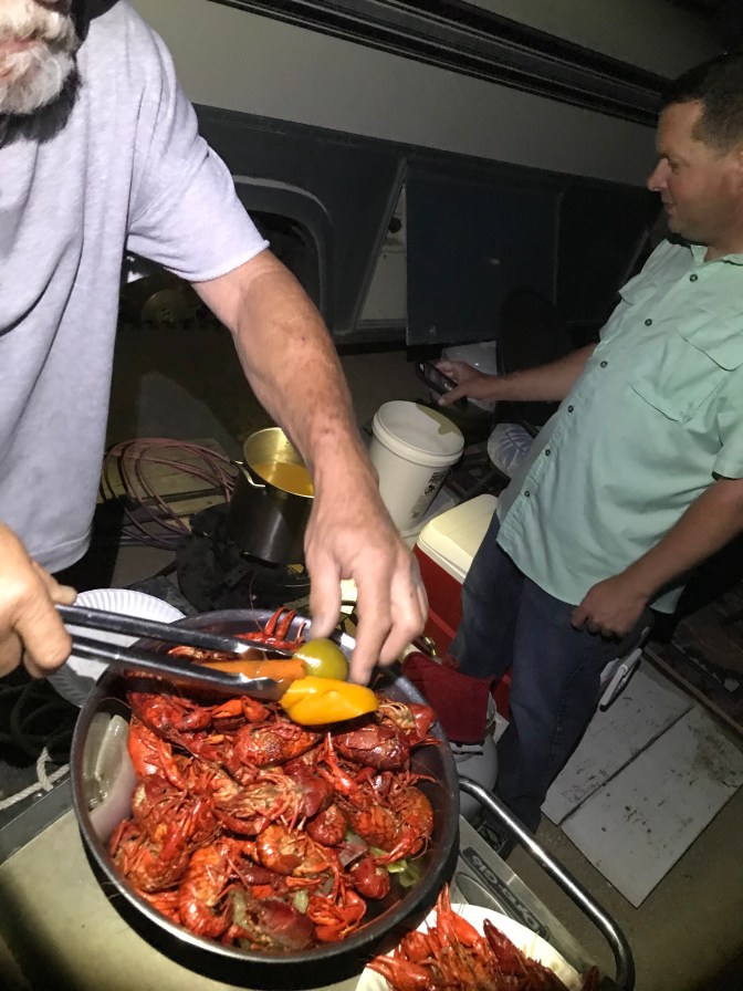 It’s a bit cooler today (89) and a good breeze. Having the creek flow beside the trailer probably helps a bit. In the afternoon I went next door and visited neighbors Jack and Sheila. They’re retired and enjoy exploring the 395 corridor and doing some hiking. They gave me a lot of information about different campgrounds and kept an eye out to make sure I made it back from Kearsarge Pass. In the evening I visited the camp hosts Scott and Linda and they were cooking up a big pot of crawdads which I haven’t had since I was a teenager. There was another young couple there from San Diego and it was fun to do some socializing and eat Scott’s excellent fresh Ceviche along with the crawdads. When I returned to the trailer I found a big juicy slice of watermelon Jack and Shiela had left for me. It’s amazing how kind and neighborly folks have been to us on this trip. They are all amazed at what Runningbird is doing and ask me to let her know they are rooting for her. Most continue to text me after I have moved on north to ask me how she is doing. Ever see the movie “The World’s Fastest Indian”? It stars Anthony Hopkins and is set in the 1960s and is based on a true story. Check it out sometime.