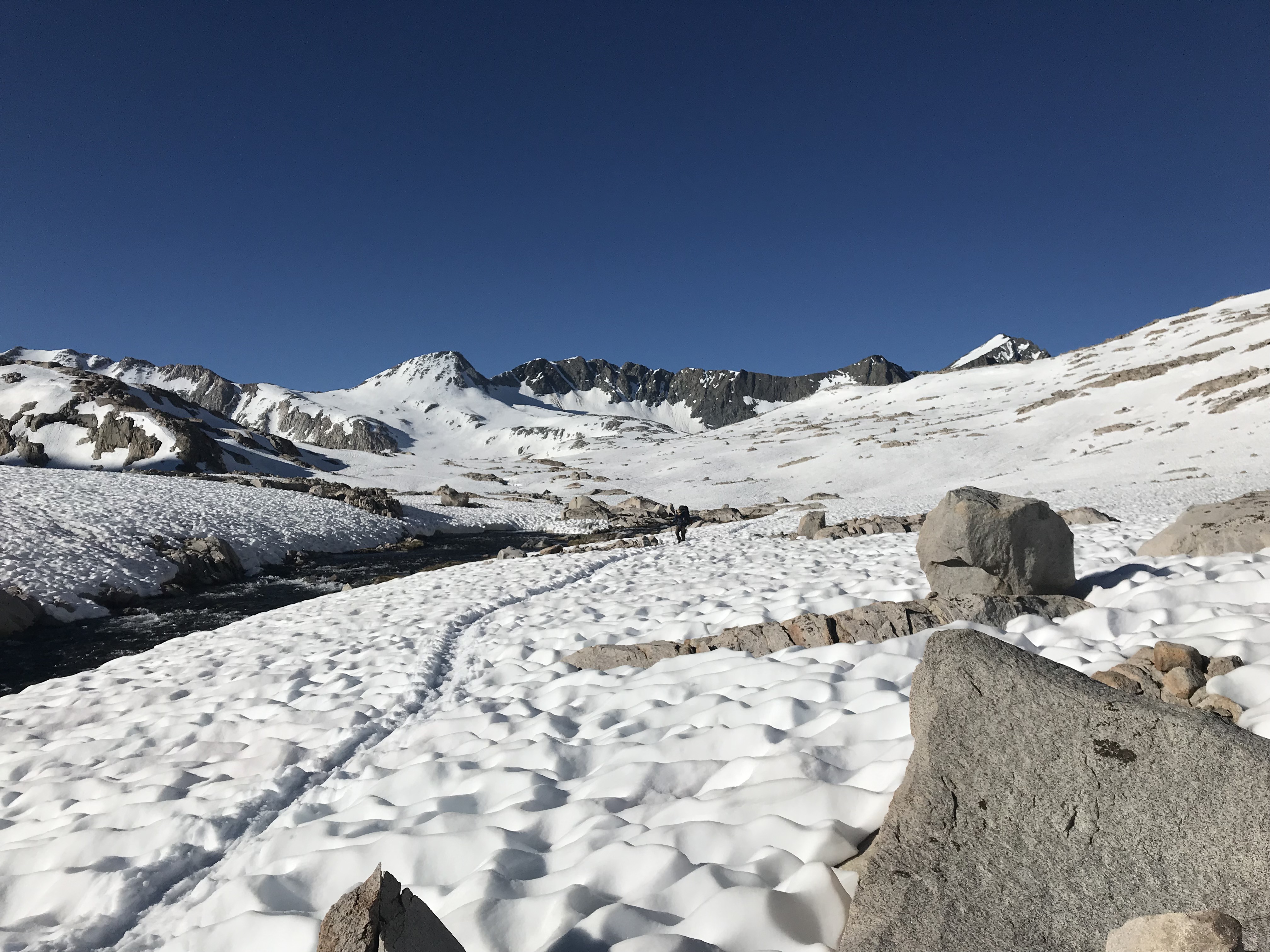 The route down from Muir Pass ws straighforward. The snow crisp in the early morning hours.