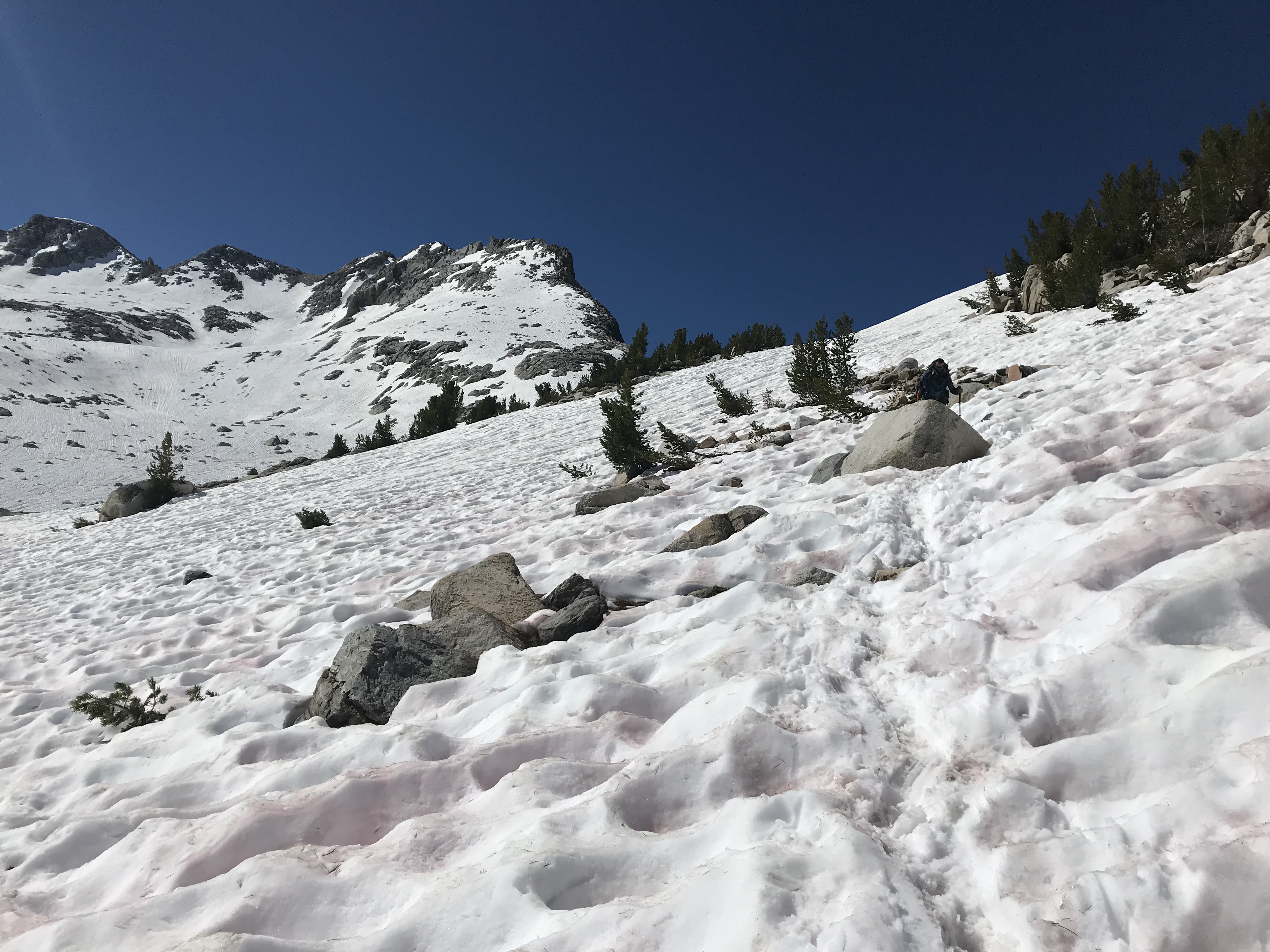 Lone Star got a signal before I did. My phone was just searching, frustrated I walked on as he spoke to his sister, we both have AT&T. About a half mile later I rounded and open view corner and tried again. David’s phone rang and rang; I could leave a message, it would be better than nothing. He answered. We were both so excited we couldn’t stop talking – but we were both talking at once! It was good we had the talk, the conditions had changed at our resupply point and details were worked out. Our MP tonight would be at the camp at the base of Silver Pass and we would walk out tomorrow.