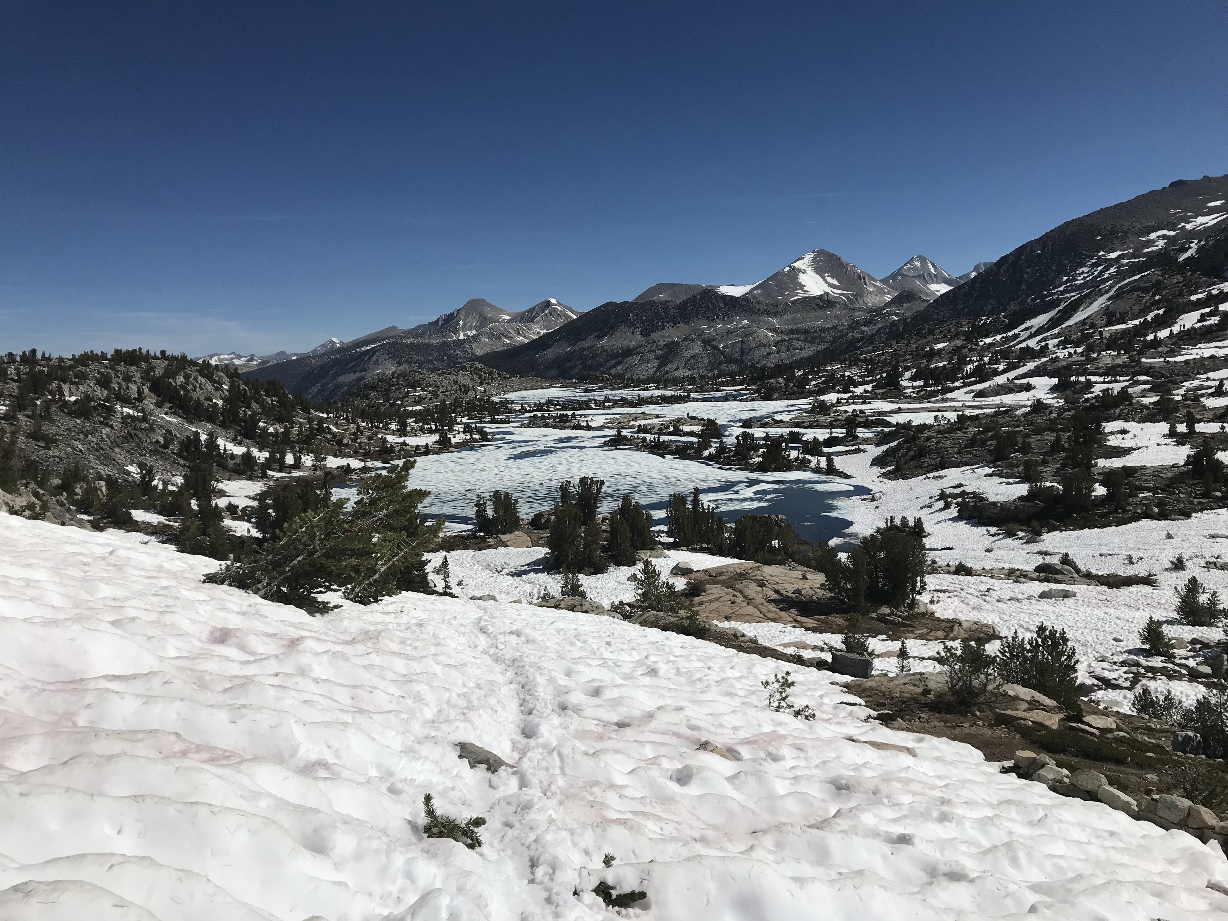 Today we traveled over Bear Ridge, what is so important about Bear Ridge? There is the chance of having a cell phone signal. It had been many days since contact and I was behind schedule by far, I longed to tell folks I was okay and would be out soon. Part of me could not believe that this time in the remote High Sierras would ever end. The going was so slow and there seemed always to be one hurdle or hazard following close on the heels of another. Our shoes were always wet from fording or simply walking in the ankle deep streams the trails had become. We now actually had enough food. Part of me had somehow thought that we would travel each day forever in these conditions, never, ever seeing our families again.