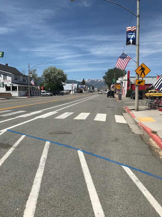 The town of Bridgeport, about 16 miles from the campground, is a real town. It has a bakery, AND they have WiFi. In the morning I drove to the town of Bridgeport to “scout out” the bakery and check to see if the local sporting goods store might have a mosquito proof shirt for Runningbird (not a chance). In town I picked up two PCT hikers from Pennsylvania headed back to the trail after having a short chill day in town. They told me the last part just before Sonora Pass had been difficult with snow fields obscuring the trail and some steep terrain. On the way up to the Pass we came upon a semi with a 52 foot trailer stuck sideways on a hairpin turn. He had obviously missed the three huge signs that said no semis with trailers over 38 feet. At the direction of the trooper, we were able to get around with a bit of off-road and get the boys back on the trail north. On my way back down I had a 40 minute wait while the tow truck pulled the semi and trailer back down to a turnout and back down the road. Sure wish I could have heard the conversations with the driver and the trooper.
