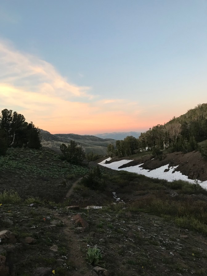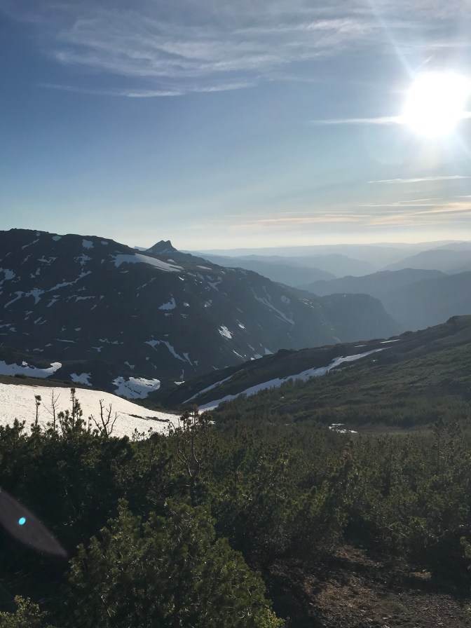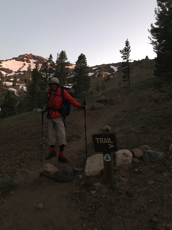 It wasn’t ten minutes before I realized I had lost the trail in the snow. After walking around in circles and trying to make sense of the two different PCT apps I had on my phone, two hikers came walking up to me. They pointed to a glissade chute they had just come from and pointed to two different directions where they had seen pieces of a trail. I started the long slow trek straight up a mountain alongside the glissade chute. Sonora Pass is at 9,000 feet and I was heading straight up from there. Runningbird was doing this kind of stuff constantly; I wouldn’t feel sorry for myself. After what seemed like an hour I was at the top of the chute (later it would take us about 3 minutes to come down this on our butts). I crossed over a crest and had to put my coat on from the cold wind. On the back side of the crest it was awesome beauty! The sun was going down in the west and the mountains seemed to go on forever. The trail proceeded fairly level along the crest of the range, there were no trees, and the vegetation was sparse. The view was spectacular. In a while I came around a corner to find Runningbird standing mid-trial, gazing off to the west with her camera in hand, appreciating the same vast beauty. We shared the moment briefly in a hug and then proceeded back the way I had come, enjoyed the long but quick glissade, did a much better job navigating back to the trailhead, and arrived at the truck just before dark. It was about 9:00 PM when we arrived at the trailer and she decided tomorrow would be a Zero day. Everything on her and in her pack was wet and needed to be dried out, and she had completely depleted her food supply. Tomorrow would be a day to rest and to reset her tracker – on the WiFi at the bakery of course.