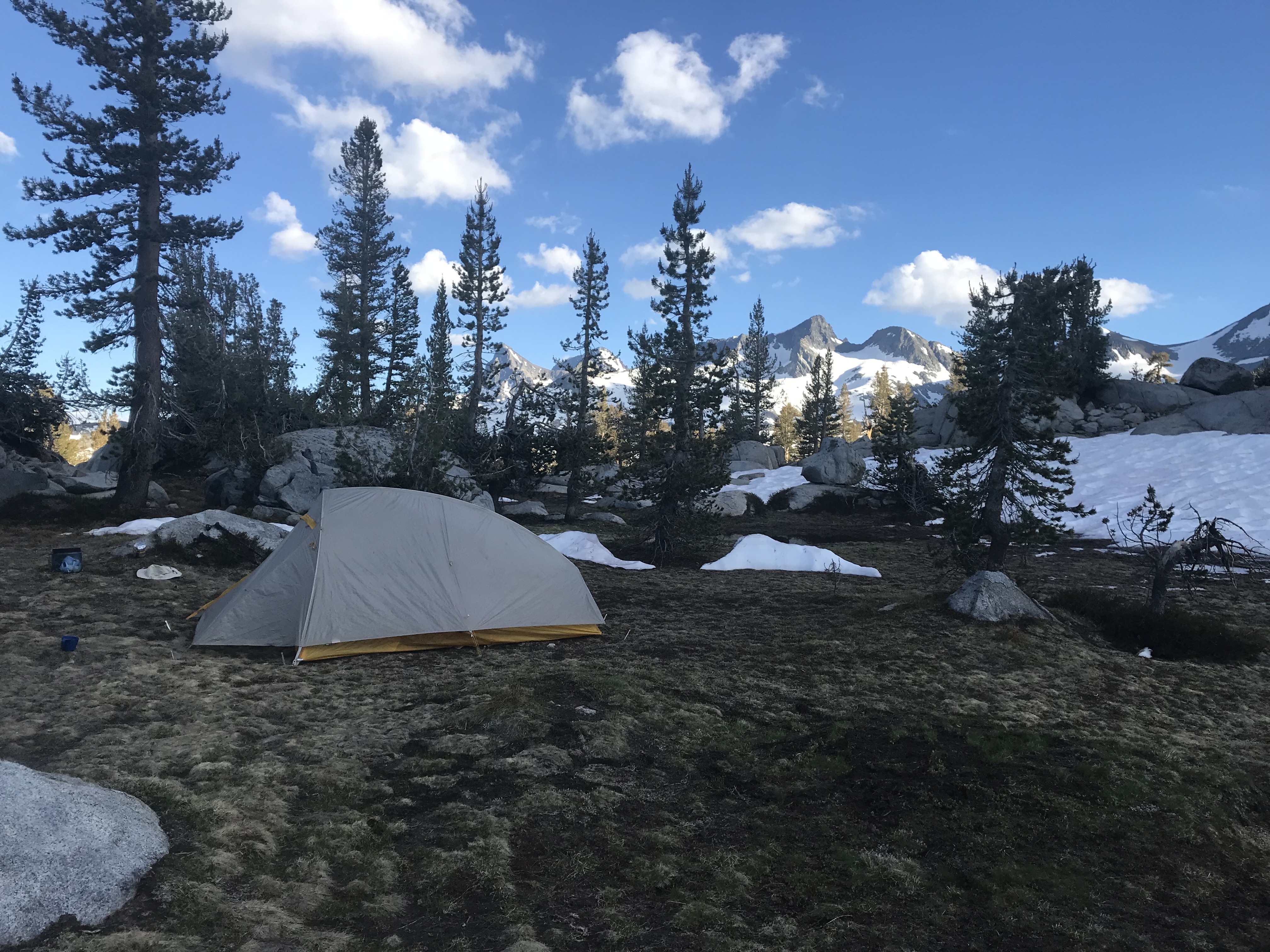 I had initially planned to cross Donahue Pass that evening and camp at a small bivvy site just over the pass. I actually stopped at 2.25 miles from the pass at 10165 ft., in the last dry, snow free spot I could find. I did not want to be navigating alone through snow with darkness falling, and I am glad I stopped when I did.