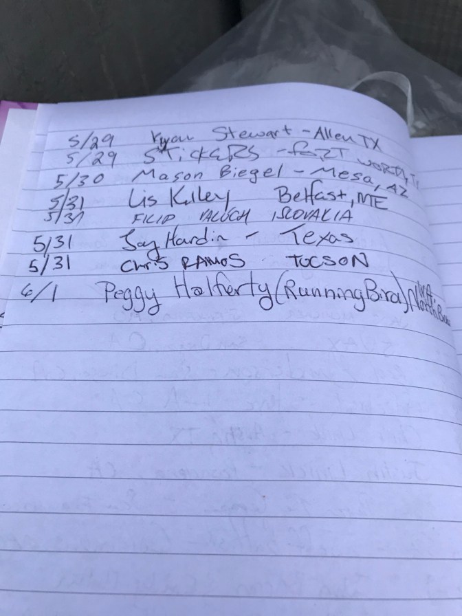 Back at the trailer I did a bit of housekeeping and prep for the next move and then decided I would drive up (with just the truck) to Carson Pass to surprise Runningbird with a Gatorade and protein shake. I was also anxious to see how she was doing with her new diet of “fuel” food and no Advil. When I got to the top of Carson Pass the main parking lot was packed full and I had to go to the nearby Sno-Park to get a spot. I didn’t have cell service up there but did check the Spot tracks again from earlier that were still on the phone and quickly calculated that, at the pace she had been making earlier, I very well may have just missed her. I jogged to the Forest Service office at the Pass hoping she might still be there. As I got closer I could see her outside the cabin door signing the register and then going back inside. She saw me immediately when I walked in, gave me a big hug, and then said to someone else, “now I have everything I need”. Then she turned to me and said, “take me home”. I was confused. What exactly did she mean? I decided I didn’t really need to push for more explanation just now. My guess was she needed another zero day.