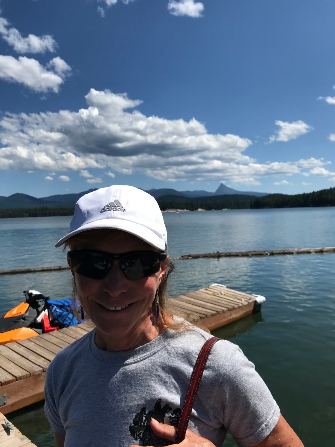 We meandered in and out of the other tourists, visited the gift shops and the old lodge, and took a few photos. We navigated through the masses back to the truck and away from the lake back to the peacefulness of our campground. After a relaxing hike along the Lemolo Lake trail to the dam and back Peggy grilled vegetables and we enjoyed a glass of wine and Smore’s before retreating back into the trailer and away from the mosquitos. In the morning after coffee, breakfast, and working crossword puzzles we went to the campground office and rented a canoe for the day. We paddled along the shoreline and in and out of the little inlets enjoying the hawks and various water birds. The water of the lake was murky from all the pine pollen and in most areas and was difficult to see more than a couple of inches into the water. On the far side of the lake we came to the inlet of the Umpqua River and the water was clear and we could see the trout dancing along the rocks and the flow line between the clean river water and the cloudy water of the lake. We turned back to head directly across the lake to the dock for lunch paddling a bit more firmly against the building breeze in the open water. In the afternoon we took the canoe out again, this time heading to the deeper waters of the north side of the lake and along the dam before returning to the dock and securing the canoe. It was a fun, relaxing day for us out on the water and enjoying the warmth of the sunshine. We have an awesome canoe at home and we agreed we would get out in it more on our home waters.