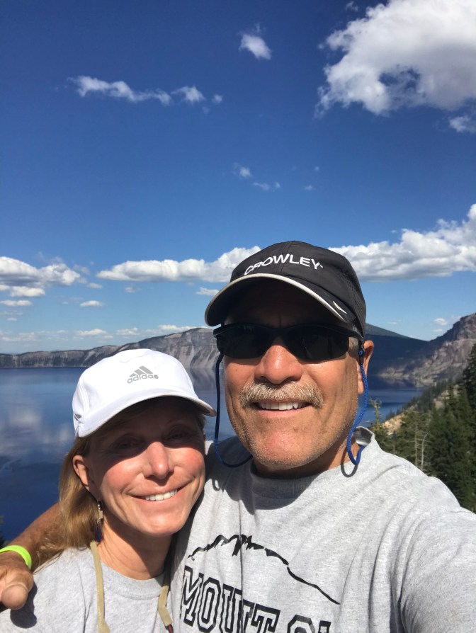 The next morning we drove the 35 miles to the Rim Village area of Crater Lake. It was a pleasant drive and on the way, not far north from Crater Lake, we pulled into a small trailhead parking lot of the PCT and found several hikers eating and relaxing. We took note of the spot as a possible resupply for the continuation of the trip next year. I’m sure Peggy had other thoughts running through her mind at that moment but this was one of the few times I actually exercised some discretion and kept my mouth closed. From here the road up and along the lake was spectacular. I can’t describe the lovely deep blue color of the lake but it was breath-taking. There were crowds at every turnout and we were just lucky to pull into the parking lot at the Rim Village just as someone was pulling out.