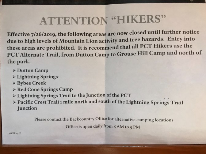 Warning posted at the USFS Ranger office and at the PCT Trailhead at Crater Lake.